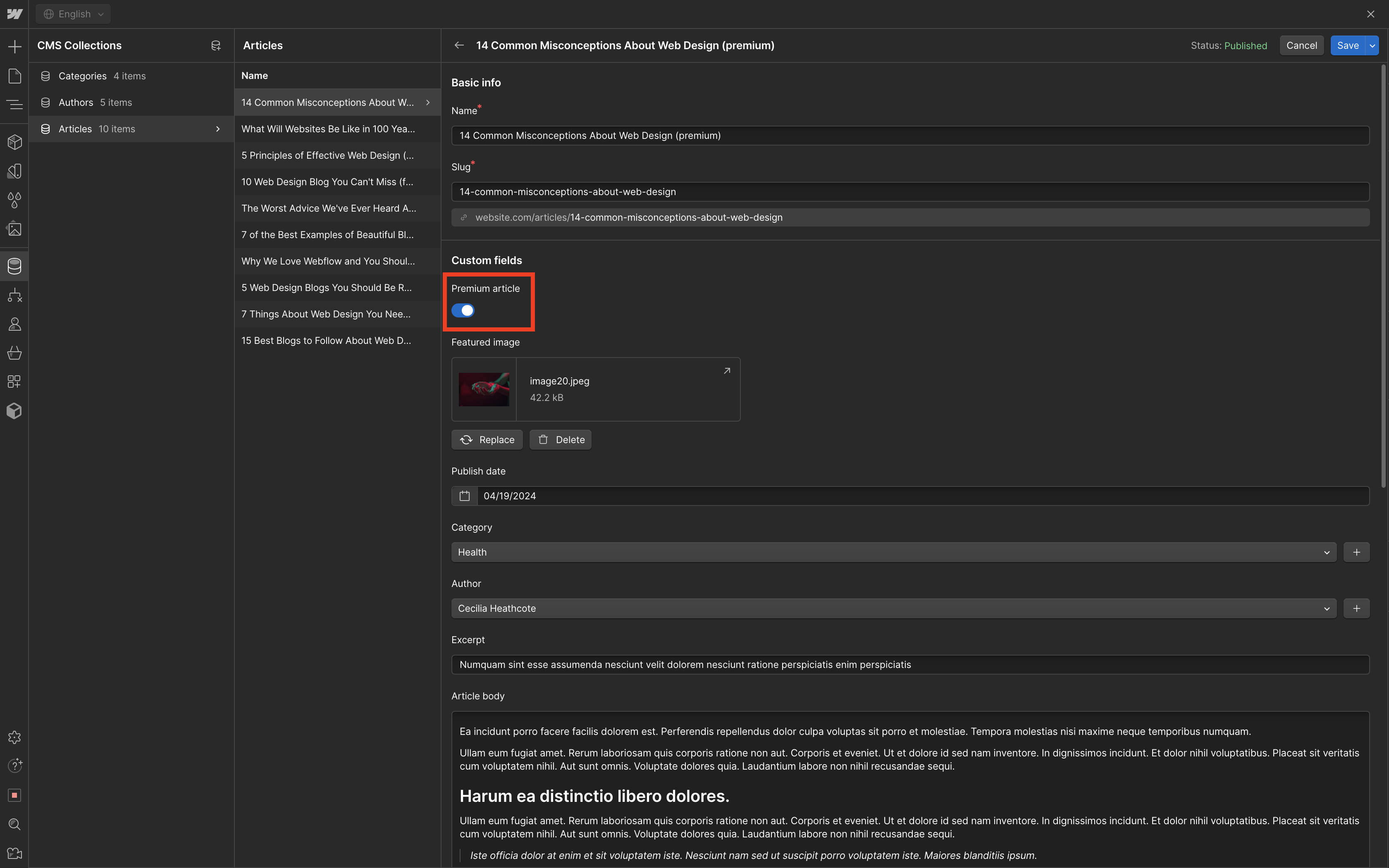 Adding your content is as easy as replacing the content in the "Articles" CMS collection. We've set this up so that you can easily choose which articles should be free for everyone and which articles should be "Premium" and only accessible to users that are subscribed and logged in. Just flip the switch on for premium articles.